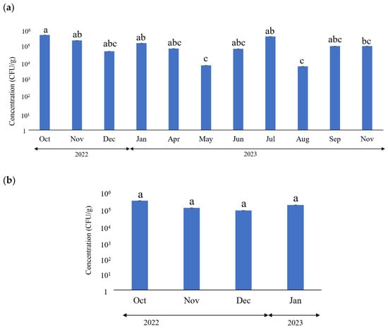 No significant differences were observed in E. coli concentration between BC (3.33 × 103–2.7 × 106 CFU/g) and DCs (1.7 × 102–7.9 × 106 CFU/g). Furthermore, the E. coli concentrations in BC and DCs did not depend on seasonal changes. However, the E. coli concentrations were significantly higher in October and November 2022 and January and July 2023 than in May and August 2023 (Figure 1). This may be associated with lower concentrations of antimicrobial medications or lower quality sanitation facilities in May and August.
