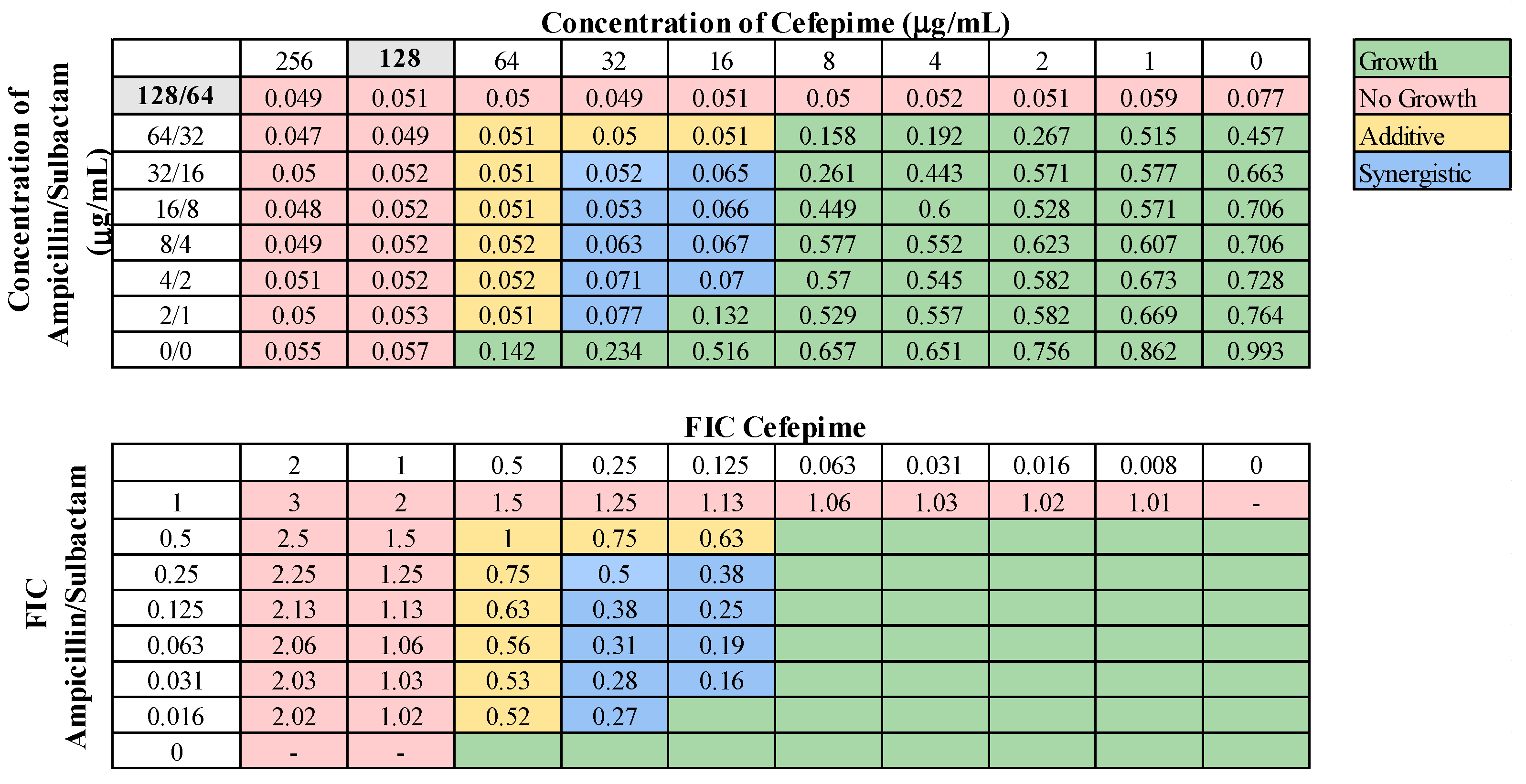 | Cefepime × Ampicillin–Sulbactam | 76.2% | 19.0% | 4.8% |