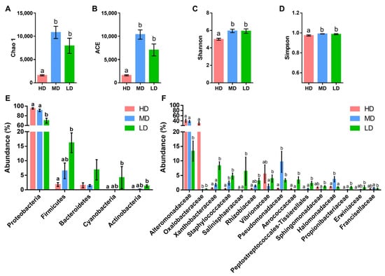 Skin microbiota, diversity, and composition. Species richness estimates (Chao 1 (A) and ACE (B)) and diversity indexes (Shannon (C) and Simpson (D)) of the bacterial communities from the skin of the gilthead sea bream reared at high (HD, n = 10), medium (MD, n = 10), and low (LD, n = 10) density; (E) bar chart representing the relative abundance in percentage of bacterial phyla in the different groups. Only phyla with an abundance higher than 0.5% in at least one group are shown; (F) bar chart represents the relative abundance in percentage of bacterial families in the different groups. Only families with an abundance higher than 0.5% in at least one group that show significant differences among groups are shown. Different letters represent statistical differences among groups within the same parameter or taxa (Kruskal–Wallis + Dunn’s, p < 0.05).