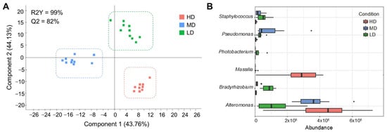 The number of skin mucus bacteria that are unique to each experimental group was regulated by stocking density, as shown in the PERMANOVA beta-diversity test (F = 7.405, R2 = 0.35, p < 0.001). Such microbiota differentiation was also evidenced by discriminant analysis that separated the three experimental groups with a correct classification of all individuals in each group (Figure 2A). The fitted PLS-DA model was statistically validated (R2Y (cum) = 99%; p < 0.05; Q2 (cum) = 82%; p < 0.05), explaining the two first components, 43.76% and 44.13% of the total variance. The fit of the PLS-DA model was validated by a permutation test (Figure S2). The resulting bacteria with significant VIP values (≥1) were 284 (Table S2A), which comprised almost the totality of the skin mucus bacteria taxa. After LEfSe analysis, the bacterial taxa with discriminant value were reduced to six genera, five of them belonging to Proteobacteria (Alteromonas, Massilia, Pseudomonas, Bradyrhizobium, and Photobacterium) and one to the Firmicutes (Staphylococcus) phyla (Figure 2B). At a closer look, a higher abundance of Alteromonas and Massilia was observed to be present in HD fish, while Pseudomonas was highly represented in MD fish. Conversely, Staphylococcus, Bradyrhizobium, and Photobacterium were overrepresented in LD fish.