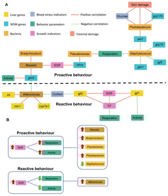 Skin microbiota and gathered biomarker analyses: (A) Correlation network performed on data from high-density reared fish (HD) showing significant positive (red lines) and negative (green lines) correlations (Spearman, p < 0.05) of discriminant skin microbiota (light orange, reduced abundance in HD; dark orange, increased abundance in HD) with biomarkers of external damage (red), growth (pink), behavior (green), blood stress indicators (purple), and liver (yellow) and muscle (blue) differentially regulated genes; (B) Correlation of Massilia with the regulation of biological processes at the local level indirectly correlated to proactive behavior. Its changes in abundance were related to other bacterial changes. Conversely, Alteromonas was related to depressed activity and respiratory rates, indirectly correlated to reactive behavior. grp170: Glucose-regulated protein 170 kDa; sirt1: Sirtuin 1; grp75: Glucose-regulated protein 75 kDa; ghr1: Growth hormone receptor 1; hif1α: Hypoxia inducible factor 1α; ghr2: Growth hormone receptor 2; cs: Citrate synthase; cox1: Cytochrome c oxidase subunit 1; cyp7a1: Cholesterol 7-Alpha-monooxygenase; igf2: Insulin growth factor 2; igf1: Insulin growth factor 1; SGR: Specific Growth Rate; CF: Condition Factor.