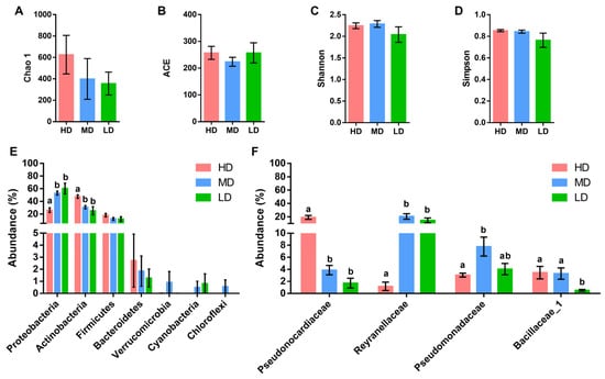 Gut adherent microbiota, diversity, and composition. Species richness estimates (Chao 1 (A) and ACE (B)) and diversity indexes (Shannon (C) and Simpson (D)) of the bacterial communities from the anterior intestine of gilthead sea bream reared at high (HD, n = 9), medium (MD, n = 9), and low (LD, n = 9) density; (E) bar chart representing the relative abundance in percentage of bacterial phyla in the different groups. Only phyla with an abundance higher than 0.5% in at least one group are shown; (F) bar chart represents the relative abundance in percentage of bacterial families in the different groups. Only families with an abundance higher than 0.5% in at least one group that show significant differences among groups are shown. Different letters represent statistical differences among groups within the same parameter or taxa (Kruskal–Wallis + Dunn’s, p < 0.05).