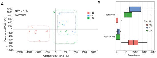 Gut adherent microbiota, discriminant analyses, and biomarkers: (A) Two-dimensional partial least squares discriminant analysis (p < 0.05) scores plot (PLS-DA) constructed using the taxonomic composition of the anterior intestine microbiota of gilthead sea bream reared at high (HD, n = 9, red dots), medium (MD, n = 9, blue dots), and low (LD, n = 9, green dots) density. Each square represents the distribution of the individual samples between the first two components in the model; (B) Linear discriminant analysis effect size analysis performed at the level of genus, representing the significant biomarkers for each group and their abundance in normalized counts.