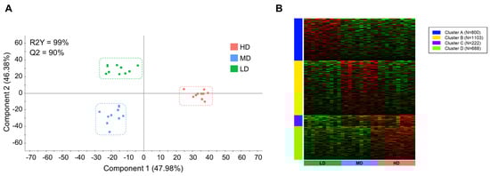Gut transcriptome, discriminant, and K-means analyses: (A) Two-dimensional partial least squares discriminant analysis (p < 0.05) scores plot (PLS-DA) constructed using the expression values of all differentially expressed genes (DESeq2, p < 0.05) of the anterior intestine microbiota of gilthead sea bream reared at high (HD, n = 10, red dots), medium (MD, n = 10, blue dots), and low (LD, n = 10, green dots) density. Each square represents the distribution of the individual samples between the first two components in the model. (B) K-means analysis separating the 2813 discriminant genes (VIP > 1 in (A)) into four clusters based on the expression levels in the different groups (Z-score). Different colors indicate different clusters, with blue indicating cluster A (n = 800, higher expression in LD), yellow indicating cluster B (n = 1103, higher expression in MD), violet indicating cluster C (n = 222, higher expression in HD and intermediate in MD), and green indicating cluster D (n = 688, higher expression in HD).