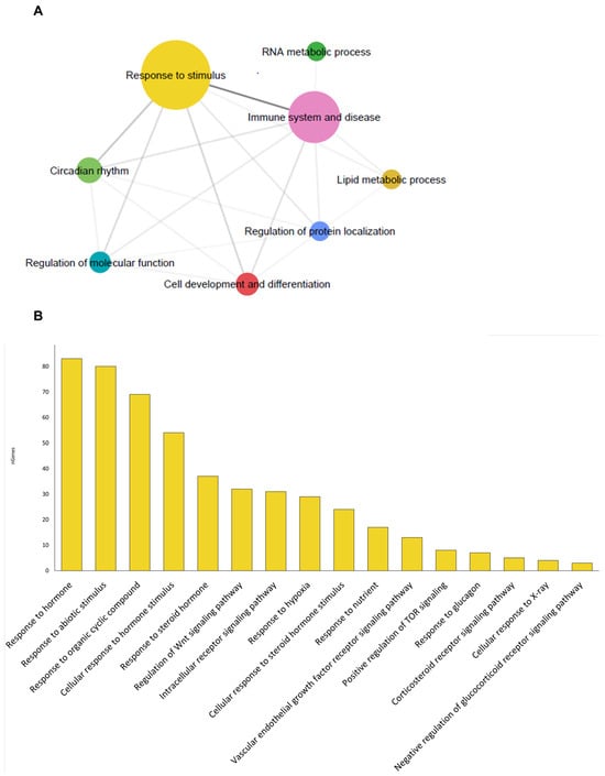Gut transcriptome, gene ontology enrichment, and correlation with bacteria taxa: (A) Network layout representing the associations between the supra-categories of overrepresented GO-BP terms of gilthead sea bream according to their shared allocated terms. Node colors correspond to the representative name of the supra-category; (B) Bar chart showing the percentage of genes within the total identified in the “response to stimulus” supra-category that have been significantly correlated with the abundance of at least one bacterial taxa.