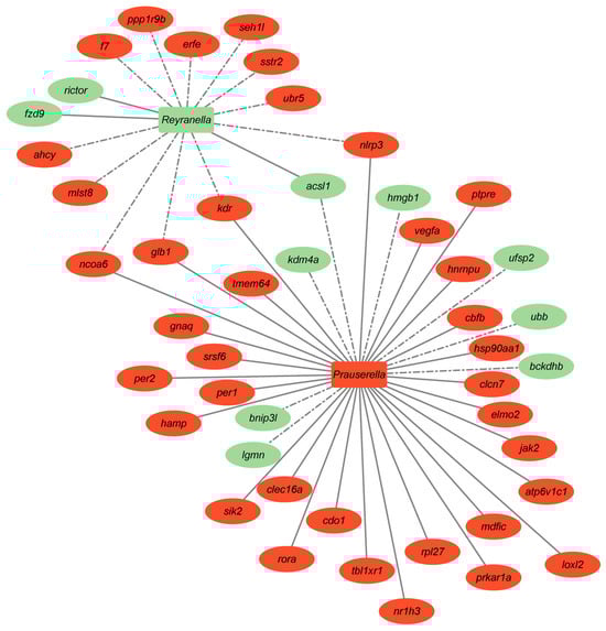 To understand the biological processes in which the DE transcripts within each cluster might be involved, an enrichment analysis was performed (Table S4). The enriched GO-BP terms were displayed and clustered in eight supra-categories: response to stimulus (189 transcripts), RNA metabolic process (8 transcripts), circadian rhythm (31 transcripts), immune system and disease (125 transcripts), lipid metabolic process (9 transcripts), regulation of molecular function (16 transcripts), cell development and differentiation (21 transcripts), and regulation of protein localization (9 transcripts) (Figure 7A). Focusing on the most abundant GO-BP supra-category, “Response to stimulus”, DE transcripts within 16 GO-BP terms were significantly correlated with at least one bacteria taxa of discriminant value (VIP ≥ 1) (Figure 7B). Filtering by Reyranella and Prauserella, Spearman correlations (p < 0.01) disclosed a complex correlation network where up to eight genes implicated in the response to hormones (urbr5, sstr2, seh1l, erfe, ppp1rgb, f7, ahcy, and mlst8) interacted in the network and were negatively correlated with Reyranella, whereas up to three genes (rictor, fzd9, acsl1) related to TOR signaling, Wnt signaling, and fatty acid metabolism were positively correlated. In contrast, seven genes (hmgb, ufsp2, ubb, bckdhb, lgmm, bnip3l, and kdm4a) mainly related to response to hormones, abiotic stimulus, and hypoxia were negatively correlated with Prauserella, while 29 genes mainly related among other processes to response to steroid hormone and organic cyclic compounds were positively correlated. Besides, Reyranella and Prauserella nodes were interconnected by five DE transcripts (ncoa6, glb1, kdr, acsl1, nlrp3), which served to interrelate an overall stimulatory rather than suppressive gut transcriptomic response with the increase in high stocking densities (Figure 8). Such a feature, triggered, in turn, an over-representation of DE genes belonging to K-means Cluster A (highly expressed genes in LD, 1506 UD) and Cluster C/D (highly expressed genes in HD, 2503 UD) in the gut microbiome-host transcriptome network. Of note, neither Prauserella nor Reyranella displayed significant correlations with liver or muscle DE expressed genes with the changing stocking density. Data on bacterial taxa for correlation analysis can be found in Table S3B.