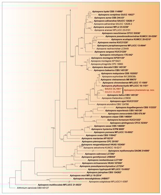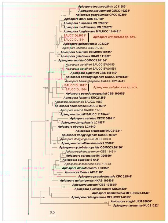 The establishment of the family Apiosporaceae by Hyde et al. in 1988 to encompass the clade consisting of Appendicospora, Apiospora, Arthrinium, Dictyoarthrinium and Nigrospora within the Amphisphaeriales highlights the importance of phylogenetic analysis in understanding the evolutionary relationships among fungi [6,18]. The classification of Apiosporaceae has been revised [5,12,13,14,15,16,17]. Three new species are introduced and described in this study: Apiospora armeniaca sp. nov., Apiospora babylonica sp. nov., and Apiospora jinanensis sp. nov. The descriptions are based on their morphological characteristics and phylogenetic status. Apiospora armeniaca was isolated from two specimens (DL1831 and DL1844) and the leaf veins of Prunus armeniaca in Kunyu Mountain National Nature Reserve, Shandong Province, China, and two specimens displayed no apparent lesions. Apiospora babylonica was isolated from specimens of Salix babylonica and saprophytic leaves in Dongying Botanical Garden, Shandong Province, China, and we isolated it from diseased and saprophytic leaves also. Apiospora jinanensis was isolated from two specimens of Bambusaceae sp. in Jinan Botanical Garden, Shandong Province, China; in fact, most species of Apiospora were isolated from Bambusaceae sp. [36].