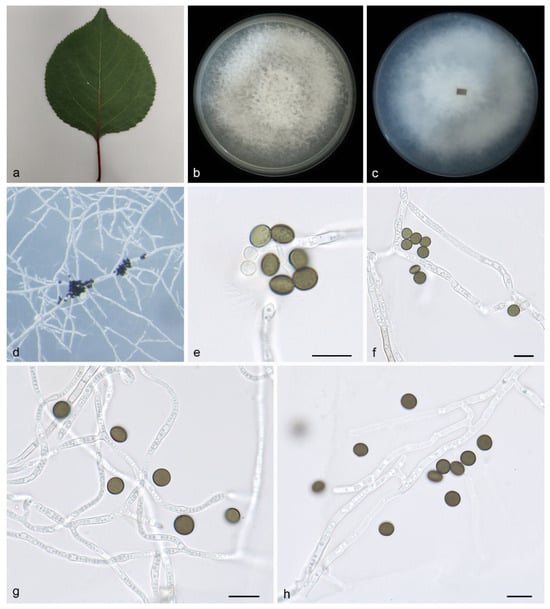 Apiospora armeniaca (HMAS 352687, holotype): (a) leaves of host plant; (b,c) colonies on PDA from above and below after 14 days; (d) colony overview; (e–h) conidia with conidiogenous cells. Scale bars: 10 μm. (e–h).