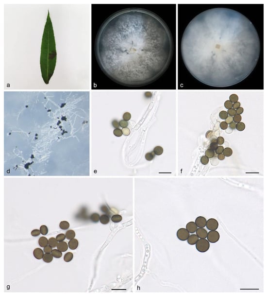 Apiospora jinanensis (HMAS 352689, holotype): (a) leaves of host plant; (b,c) colonies on PDA from above and below after 14 days; (d) colony overview; (e,f) conidia with conidiogenous cells; (g,h) conidia. Scale bars: 10 μm. (e–h).