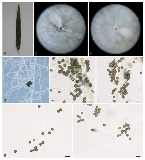 Apiospora babylonica (HMAS 352688, holotype): (a) leaves of host plant; (b,c) colonies on PDA from above and below after 14 days; (d) colony overview; (e,f) conidia with conidiogenous cells; (g,h) conidia. Scale bars: 10 μm. (e–h).