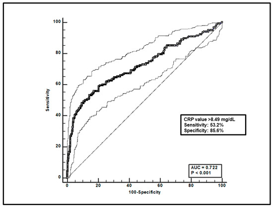 | C-reactive protein | 599 | 8.49 mg/dL | 0.72 (0.68–0.76) | 53.2% | 85.6% | <0.0001 |