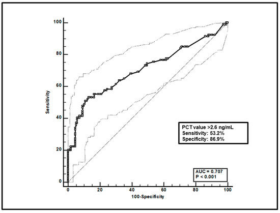 | Procalcitonin | 247 | 2.6 ng/mL | 0.71 (0.63–0.77) | 53.2% | 86.9% | <0.0001 |