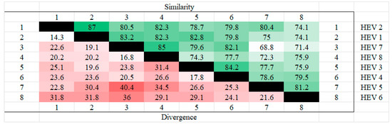 Homozygosity analysis of ORF3 in different genotypes. HEV 1(AAA45735.1), HEV2(AAA45731.1), HEV3(BAC44898.1), HEV 4(BAE02702.1), HEV5(BAJ77117.1), HEV 6(BAO31622.1), HEV7(AHY61297.1), HEV8(AOR52321.1). From the figure, it can be seen that HEV1 and HEV2 have the highest ORF3 homology and HEV7 and HEV8 also have high homology, whereas the highest dissimilarity is found in HEV5 and HEV7, followed by HEV6 and HEV7, which also have high dissimilarity.