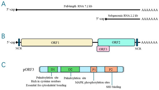 (A)The hepatitis E virus genome RNA—genomic RNA and bicistronic subgenomic RNA. (B) Open reading frames. (C) Structure of ORF3 protein.