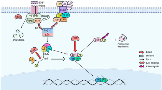 Pathways of NF-κB activity inhibition by ORF3. ORF3 directly promotes the degradation of TRADD to inhibit NF-κB activity, on the one hand, and inhibits NF-κB activity by directly inhibiting the dephosphorylation of IKKβ, on the other hand. In addition, IκBα activation needs to be facilitated by the dephosphorylation of IKKβ, so ORF3 not only directly inhibits IκBα activation, but also indirectly inhibits IκBα activation by inhibiting IKKβ activation.