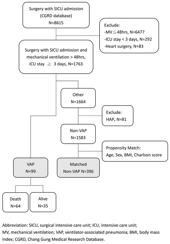 Over eleven years, 8615 surgical patients were admitted to the SICU at Kaohsiung Chang Gung Memorial Hospital, of which 1763 non-cardiac surgical patients who had an ICU stay exceeding three days and required MV for more than 48 h were identified. Of these, 99 patients (5.6%) were classified into the VAP group. The remaining 1583 patients were categorized as the non-VAP group, as illustrated in Figure 1.
