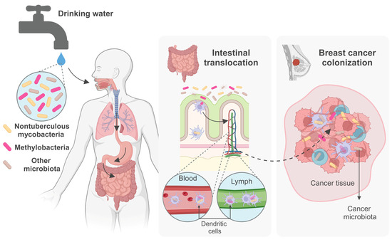Hypothetical pathways of microbiota from drinking water into the gut–breast axis. Following ingestion, drinking water microbiota, including NTM, all selected by artificial disinfection and the plumbing system’s harsh conditions, may cross the acidic gastric environment, reach and eventually traverse the intestinal epithelium, and enter immune cells, aiding their dissemination via the bloodstream or lymphatic system. These pathways offer potential routes for drinking water microbiota to reach breast tissue, where they may integrate into the intratumoral microbiota. (Created with BioRender.com, https://help.biorender.com/hc/en-gb/articles/17605511350685-Citing-BioRender, 27 May 2024).