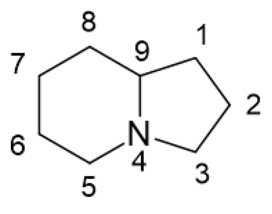Indolizidines represent a class of structurally related alkaloids. Their core structure consists of a bicyclic framework comprising one cyclohexane and one cyclopentane, linked together through C9 and N4 (Figure 1). Indolizidine derivatives can be extracted from various plant species, including legumes and orchids, as well as from certain animal species, such as ants, contributing to their diverse natural occurrence [1].