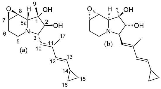 Figure 4. Chemical structure of the first-ever isolated cyclizidine M146791 from Streptomyces sp. NCIB 11649 as (a) originally proposed in 1987 [16] and revised in 2010 (b) [36].