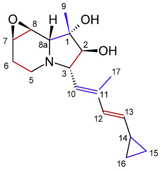 Figure 5. Numbering of the cyclizidine carbons and incorporation of acetate (red) and propionyl (blue) precursors in the cyclizidine structure, as proposed in [37] (modified by the author).
