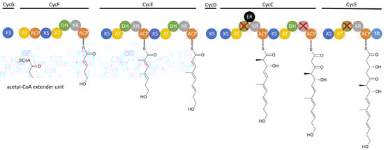 The cyclizidine PKS in strain NCIB 11649 has been elucidated by in vitro biochemical analysis as well as in vivo mutagenesis studies. The cluster is made up of seven modules, which are encoded in six genes, named cycB to cycG (Figure 6). Module 1 recruits the first acetyl-Coenzyme A (CoA) starter unit without further reduction of the unit. Module 2 includes a KR and DH domain, which results in the formation of a double bond in the second extender unit. This is also true for modules 3 and 4. Module 3 uses methylmalonyl-CoA as the elongation unit, which introduces an additional methyl group. Module 5 contains not only a KR and DH domain but also an ER domain. However, since the DH domain is not functional the modification of the extended unit of the polyketide stops at the hydroxy group. The KR domain in module 6 is also not functional, which results in a keto group there. Finally, in module 7, one last hydroxy group is added before the chain is released via the TR domain. The resulting chain is then modified further outside of the PKS. Additional open reading frames code for an aminotransferase, multiple oxidoreductases, a flavin reductase, and a ribonucleotide reductase, which collectively catalyze the cyclization reactions. This leads to the formation of the indolizidine core structure and the name-giving cyclopropane ring. The further biosynthetic pathway after the formation of the polyketide chain has yet to be experimentally verified [35].