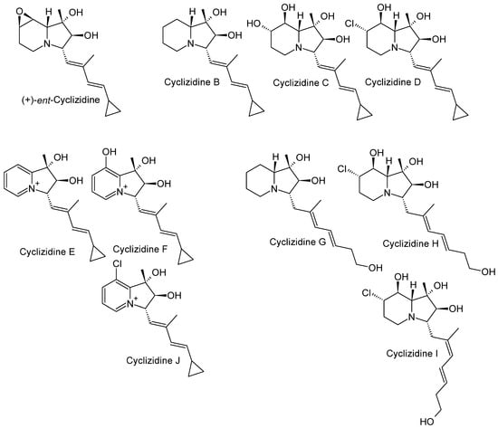 Figure 7. Structures of the 10 cyclizidines isolated from Streptomyces sp. HNA39 [12,43].