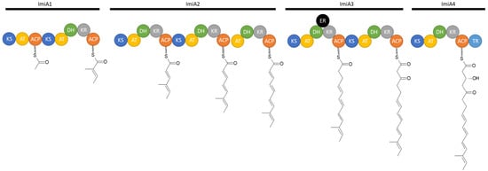 In addition to the isolation of these two compounds, the biosynthetic pathway of iminimycins was elucidated by bioinformatic analysis and subsequent inactivation of several genes within the biosynthetic gene cluster. Bioinformatic analysis revealed 22 genes, named imiA to imiT. Four genes, imiA1 to 4, encode a type I PKS (Figure 10) that synthesizes the polyketide chain on which the iminimycin structure is based. Eight modules forge the iminimycin chain. The acyltransferase domain of the first module was predicted to select (2S) methylmalonyl-CoA as the starter unit [51].