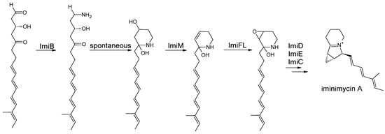 Eight modules in the gene cluster form a 16-membered polyketide chain: a tetraene is followed by modules with a fully oxidized keto moiety and a hydroxy group. After release, the group terminates in an aldehyde moiety. This aldehyde moiety is aminated by ImiB (Figure 11). The aminated polyketide chain undergoes a spontaneous cyclization reaction forming the six-membered ring of the indolizidine structure. Elimination of the hydroxy group at C4 results in a C4C5 double bond, which is oxidized to form the epoxide ring. The subsequent reactions are expected to be catalyzed by ImiM and ImiFL, respectively. The following ring formation reaction, which completes the indolizidine core structure and results in iminimycin A, is catalyzed by ImiD, C, and E [51].