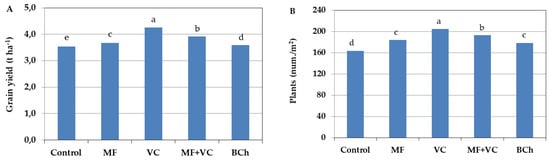 Barley grain yield affected by different fertilization types (A) and the number of plants per square meter (B). The results shows the mean of four replicates. Different letters indicate statistically significant differences between treatments at a significance of p ≤ 0.05. MF—mineral fertilizer; VC—vermicompost; MF+VC—combined application; BCh—biochar.