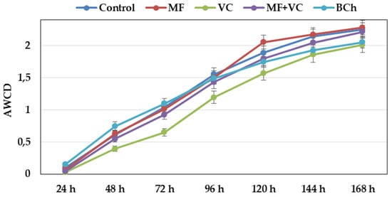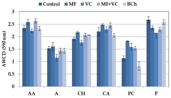 The AWCD showed different metabolic rates of carbon-source utilization during the experiment (Figure 2). From the beginning, the slope of the curves was steep at all time points until the end. The community utilization rate was lower in the VC treatment during the whole study. After 144 h, the utilization of VC and BCh was similar, while that of the rest of the treatments was slightly higher. The highest AWCD value was observed in MF, followed by the control and MF+VC treatments.