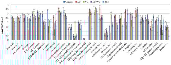 Figure 4 shows the AWCD utilization capacity of each one of the carbon sources in corresponding treatments. The most complete utilization source was the itaconic acid in MF, with a difference of 30 to 37% compared to the rest of the treatments. D-mannitol (MF) and γ-hydroxybutyric acid (VC) were also C-sources with high utilization rates. Still, the difference with the rest of the treatments was not as high as in itaconic acid (8–17% and 1–20%). Lower utilization was found for 2-hydroxy benzoic acid, α-ketobutyric acid, and D,L-α-glycerol phosphate. The last one had good utilization in VC treatment but was very low in the rest.
