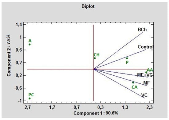 Figure 5 represents a biplot in the first and second principal component (PC) dimensions under different fertilization cases. The carbohydrates and polymers had positive values for the first and second PC. The highest absorption rate of any treatment in the experiment distinguished these two carbon groups. PC1 contributed 90.6% to the total variation and correlated greatly with amino acids, carboxylic acids, and polymers. PC2 contributed 7.5% and was associated mainly with amines and amides. The lowest absorption rate had phenolic compounds, amines, and amides, where even the amines and amides had negative values for PC1, while the phenolic compounds had negative values for both PCs. The highest correlation between the control and BCh was found concerning C-source consumption. As can be seen from the graph, they form an acute angle. The lowest correlation of the control is found with VC, followed by the MF and combined MF+VC treatments.