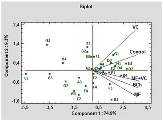In Figure 6, the C-source utilization in treatments is compared using PCA. In this case, both PCs formed 94.2% of the total variation. PC1 influenced 74.9% of the variations, while PC2 had 9.3% weight. The main possitive association of PC1 was with E3, D2, B4, H1, and D4 (γ-hydroxybutyric acid, D-mannitol, L-asparagine, α-D-lactose, and L-serine, respectively). The lowest association with this component was observed for C3, H2, G3, H4, and G2 (2-hydroxy benzoic acid, D,L-α-glycerol phosphate, α-ketobutyric acid, putrescine, and glucose-1-phosphate, respectively). The highest positive rate of influence of PC2 was found for H2, H3, and B2 (D,L-α-glycerol phosphate, D-malic acid, and D-xylose, respectively), while the lowest was for B1, C2, G4, F4, and F3 C-sources (pyruvic acid methyl ester, i-erythritol, phenylethylamine, glycyl-L-glutamic acid, and itaconic acid, respectively). The highest correlation of the control was found with VC. As can be seen from the graph, they form an acute angle between themselves. The treatments MF and MF+VC formed the highest correlation with each other, as seen from the graph; they form an acute angle among themselves.