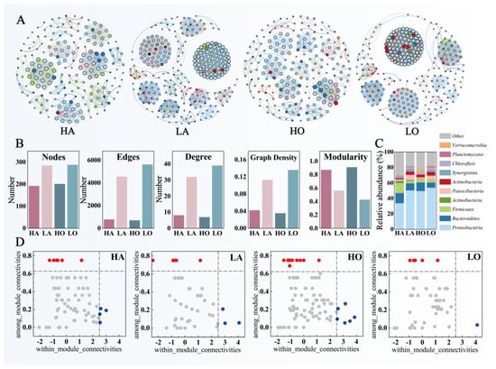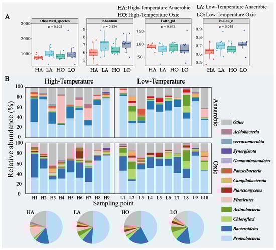 In this study, the environmental temperature of the activated sludge samples showed significant inter-sample differences. Samples with higher temperatures can reach temperatures up to nearly 35 °C, while samples with lower temperatures can stabilize as low as below 15 °C. Using an average sample temperature of 25 °C as the dividing line, the samples in this study were categorized into the “high-temperature group” and “low-temperature group”. Further, the samples were subdivided into “high-temperature anaerobic group” (HA), “low-temperature anaerobic group” (LA), “high-temperature oxic group” (HO), and “low-temperature oxic group” (LO). In this study, the differences in other environmental variables such as DO and pH were relatively small, and the nutrients such as carbon and nitrogen were basically in the appropriate range for the growth and functioning of activated sludge, meeting the sample conditions for grouping research (Figure 1B) (Table S2).