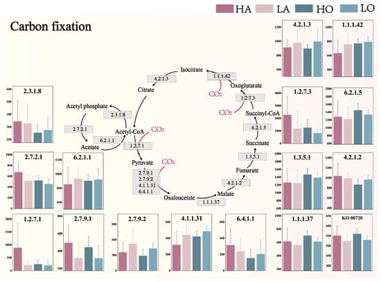 Although the overall potential of the carbon fixation process is positively correlated with temperature, to investigate the CO2 fixation capacity of the activated sludge system in practical applications, several major CO2–substrate carbon conversion sub-processes were analyzed in detail. The differential response of these specific pathways to temperature fluctuations highlights the complexity of metabolic regulation in microbial communities and underscores the importance of considering multiple process levels when assessing ecosystem function under changing environmental conditions. These processes are “acetyl-CoA to pyruvate”, “pyruvate to oxaloacetate”, “succinyl-CoA to oxoglutarate”, and ‘oxoglutarate to isocitrate’. The potential of these processes directly reflects the ability of the activated sludge community to utilize CO2. Notably, the activated sludge in the high-temperature anaerobic group showed very significant potential enhancements in the conversion of acetyl-CoA to pyruvate (EC: 1.2.7.1) and the conversion of succinyl-CoA to oxoglutarate (EC: 1.2.7.3) by 309.05% and 90.69%. It is hypothesized that CoA may be one of the key factors in the enhanced carbon fixation capacity of the high-temperature anaerobic group. High temperature may increase the regeneration rate of CoA to ensure its availability in the corresponding metabolic pathway [49] and facilitate the rapid progression of acetyl-CoA and succinyl-CoA transformations [50,51]. As for the activated sludge microbial community, the enhancement of the above-mentioned relevant metabolic pathways is likely more significant under anaerobic conditions.