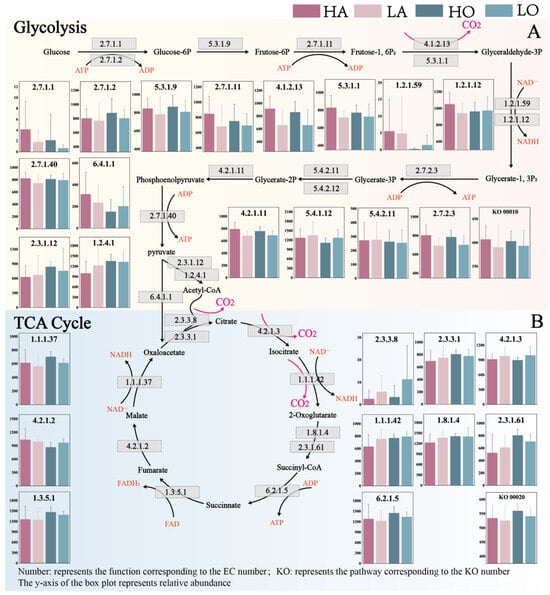 Carbon transformation potential of different types of AS microbial communities in industrial WWTPs (based on PICRUSt2 and KEGG, the subprocess is based on the numerical analysis of level 3 functional EC, and the overall process is based on the numerical analysis of level 2 functional KO). (A) Glycolysis process. (B) TCA cycle process (KO00010 and KO00020 mean series of enzymes with the same pathway of “Glycolysis/Gluconeogenesis” and “TCA cycle”).