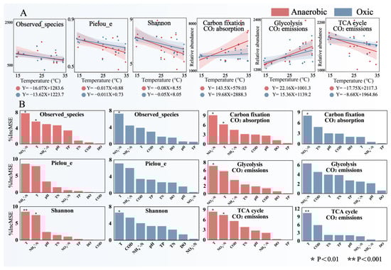 Contribution of environmental indicators to the community characteristics and CO2 absorption and emissions potential of anaerobic and oxic AS in industrial WWTPs (based on alpha diversity and microbial functional potential predicted by PICRUSts2). (A) Construction of diversity index linear regression model to validate the effect of temperature. (B) Contribution of environmental indicators to sludge microbial community characteristics analyzed using random forest.
