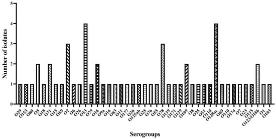 - Orskov, I.; Orskov, F.; Jann, B.; Jann, K. Serology, Chemistry, and Genetics of O and K Antigens of Escherichia coli. Bacteriol. Rev. 1977, 41, 667–710. [Google Scholar] [CrossRef]