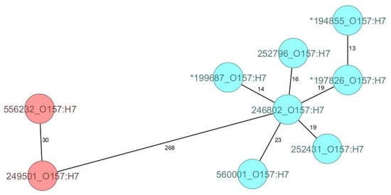 The minimum spanning tree (MST) of the Shiga toxin-producing E. coli (STEC) serotype O157:H7 Romanian strains analysed in this study (historical strains included), based on core-genome multilocus sequence type allelic profiles. The analysis and tree were obtained with the public Ridom-SeqSphere+-integrated E. coli cgMLST scheme of 2513 target loci. On the tree, allele distances between samples are indicated. The different colours are related to the sequence types, with red indicating ST11 and blue ST1804. The asterisk (*) placed before the strain ID denotes a historical strain.