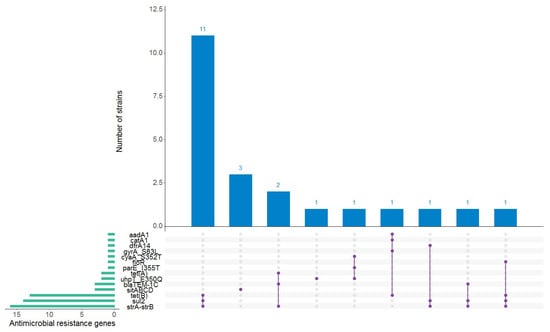 Antimicrobial resistance (AMR) genes found in the autochthonous Shiga toxin-producing Escherichia coli strains. The horizontal green bars represent the frequency of each antimicrobial resistance gene. An AMR genotype is represented by the purple linked dots. The blue vertical bars represent the number of strains positive for a particular AMR genotype. This figure was generated using RStudio version 1.2.5001 [24] with the UpSetR package [25].