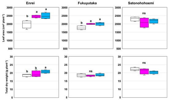 Effects of co-inoculating PGPB with B. ottawaense SG09 on leaf area and total dry weight in three different soybean cultivars at 7 weeks after sowing. Different letters indicate classes that exhibit significant differences (p < 0.05) using Duncan’s multiple range test. “ns” indicates not significant (p > 0.05). The white, pink, and blue boxes represent the treatments SG09, SG09 + OFT2, and SG09 + OFT5, respectively.