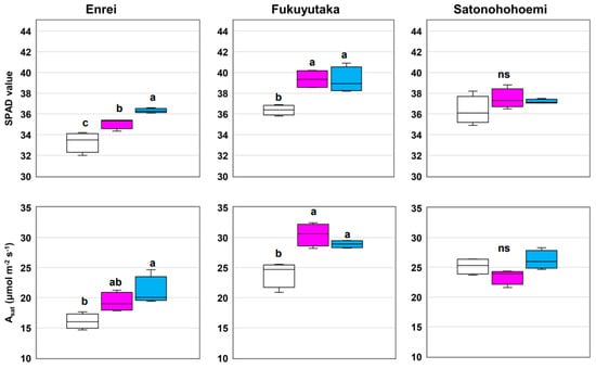 Effects of co-inoculating of plant growth-promoting bacteria with B. ottawaense SG09 on the leaf chlorophyll content (SPAD value) and photosynthesis rate (Asat) of three different soybean cultivars at 7 weeks after sowing. Different letters indicate classes that exhibit significant differences (p < 0.05) using Duncan’s multiple range test. “ns” indicates not significant (p > 0.05). The white, pink, and blue boxes represent the treatments SG09, SG09 + OFT2, and SG09 + OFT5, respectively.