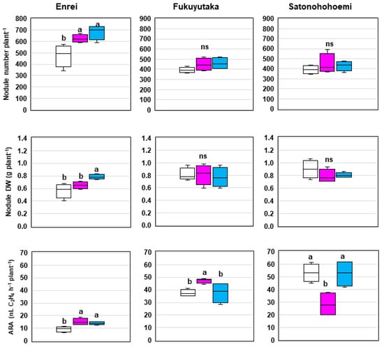 Effects of co-inoculating PGPB and B. ottawaense SG09 on nodule numbers, nodule dry weight, and N2 fixation (ARA) in three different soybean cultivars at 7 weeks after sowing. Different letters indicate classes that display significant differences (p < 0.05) using Duncan’s multiple range test. “ns” indicates not significant (p > 0.05). The white, pink, and blue boxes represent the treatments SG09, SG09 + OFT2, and SG09 + OFT5, respectively.