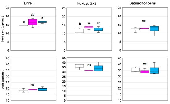 Effects of co-inoculating plant growth-promoting bacteria with B. ottawaense SG09 on seed yield and aboveground biomass in three different soybean cultivars at maturity. Different letters indicate classes that display significant differences (p < 0.05) using Duncan’s multiple range test. “ns” indicates not significant (p > 0.05). The white, pink, and blue boxes represent the treatments SG09, SG09 + OFT2, and SG09 + OFT5, respectively.
