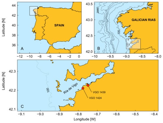 Map of the study area, showing (A) the Iberian Peninsula, (B) the Galician Rías in NW Iberia (rectangle indicates Ría de Vigo), and (C) the location of the two sampling stations (red circles) where A. minutum strains (VGO 1424 and VGO 1439) were isolated.
