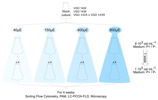 Experimental design scheme. The cultures consisted of strains VGO 1424, VGO 1439, and a mixture of both (VGO 1424 × VGO1439). Light irradiance was set at 40, 150, 400, and 800 µE m−2 s−1. The cultures were grown in medium L1-Si (P+) or L1-Si without phosphate (P−). The cell concentration at the start of the 1-week acclimation was 6 × 103 cells mL−1. The starting cell concentration thereafter was 1 × 103 cells mL−1 (4 replicates). During a ~4-week period, the cultures were analyzed via sorting flow cytometry, Pulse Amplitude Modulation (PAM), liquid chromatography post-column oxidation followed by florescence detection (LC-PCOX-FLD) and microscopy.