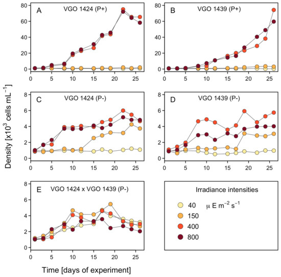 Growth rates of A. minutum (cell densities: ×103 cells mL−1) during the 26-day experiment under four irradiance intensities. (A,C) VGO 1424; (B,D) VGO 1439; (E) VGO 1424 × VGO 1439 cross. Medium L1-Si with phosphate (P+) or L1-Si without phosphate (P−).