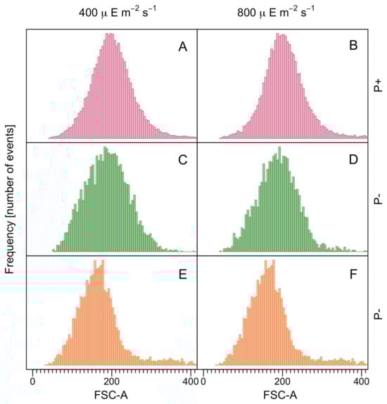 Given the very low growth at 40 and 150 µE m−2 s−1 (<5500 cells mL−1), the analyses of the cell size were limited to the cultures under the irradiances of 400 and 800 µE m−2 s−1. The different irradiances did not result in significant differences in the mean cellular FSC, either within the same treatment group or between groups (Figure 4).