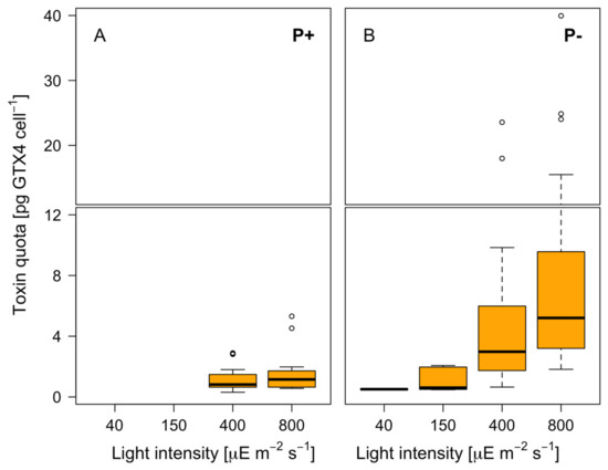 Toxin quota (pg GTX4 cell−1) at the tested light intensities. (A) Clonal (P+); (B) Clonal-P and Cross-P (P−).