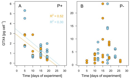 The temporal evolution of the GTX4 production was also monitored (Figure 6). The toxin production by the Clonal strains at the two highest irradiances (400 and 800 µE m−2 s−1) declined significantly over time. For the Clonal-P and Cross-P cultures, both of which produced significantly higher levels of toxin than the Clonal culture, the toxin production increased until the midpoint of the experiment and then decreased.